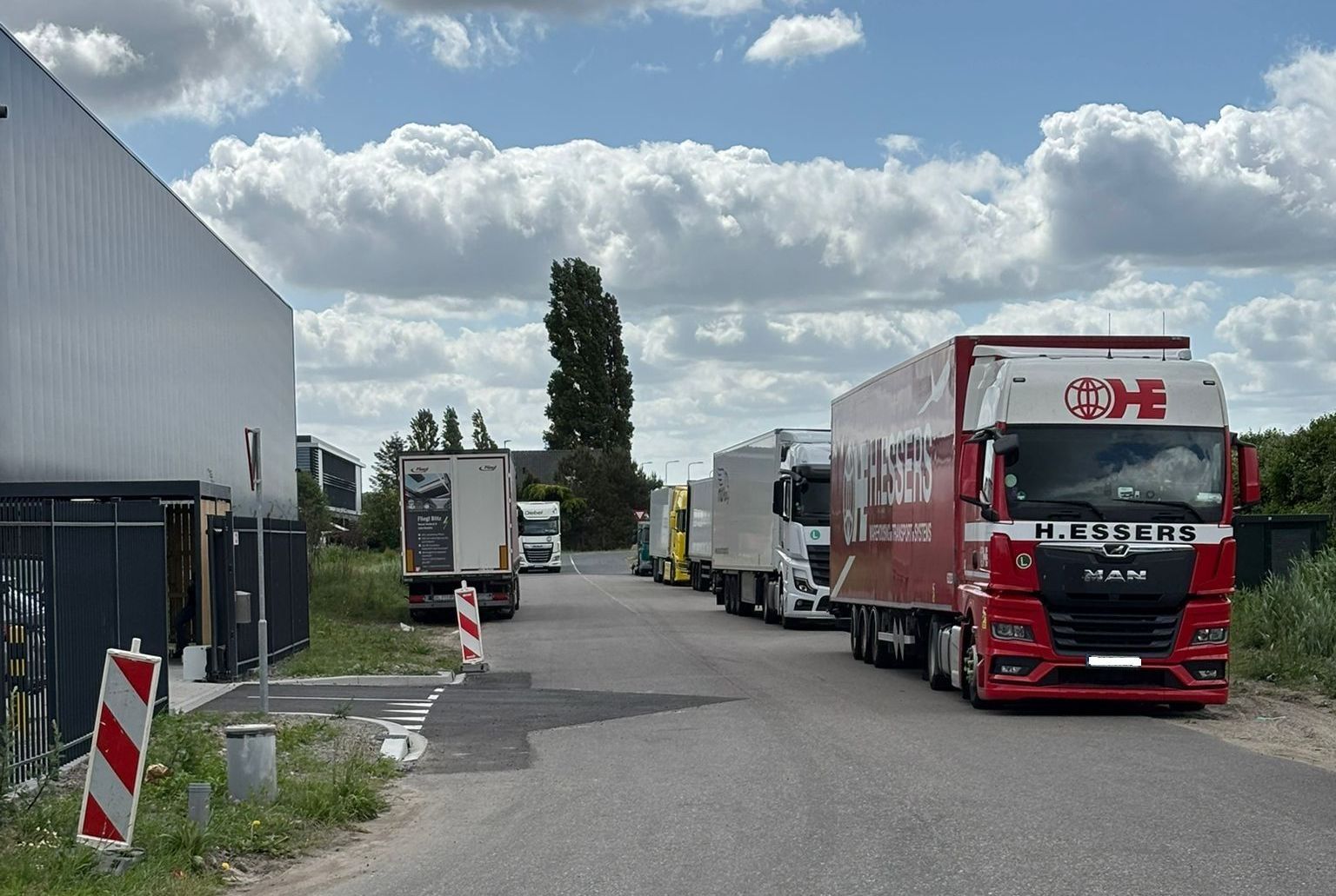 Vrachtwagens staan geparkeerd langs de Samoaweg, wachtend om te kunnen lossen/laden. Hier geldt een parkeerverbod. De Samoaweg wordt een doorgaande weg richting de nieuw te bouwen supermarkt. Foto's; aangeleverd.